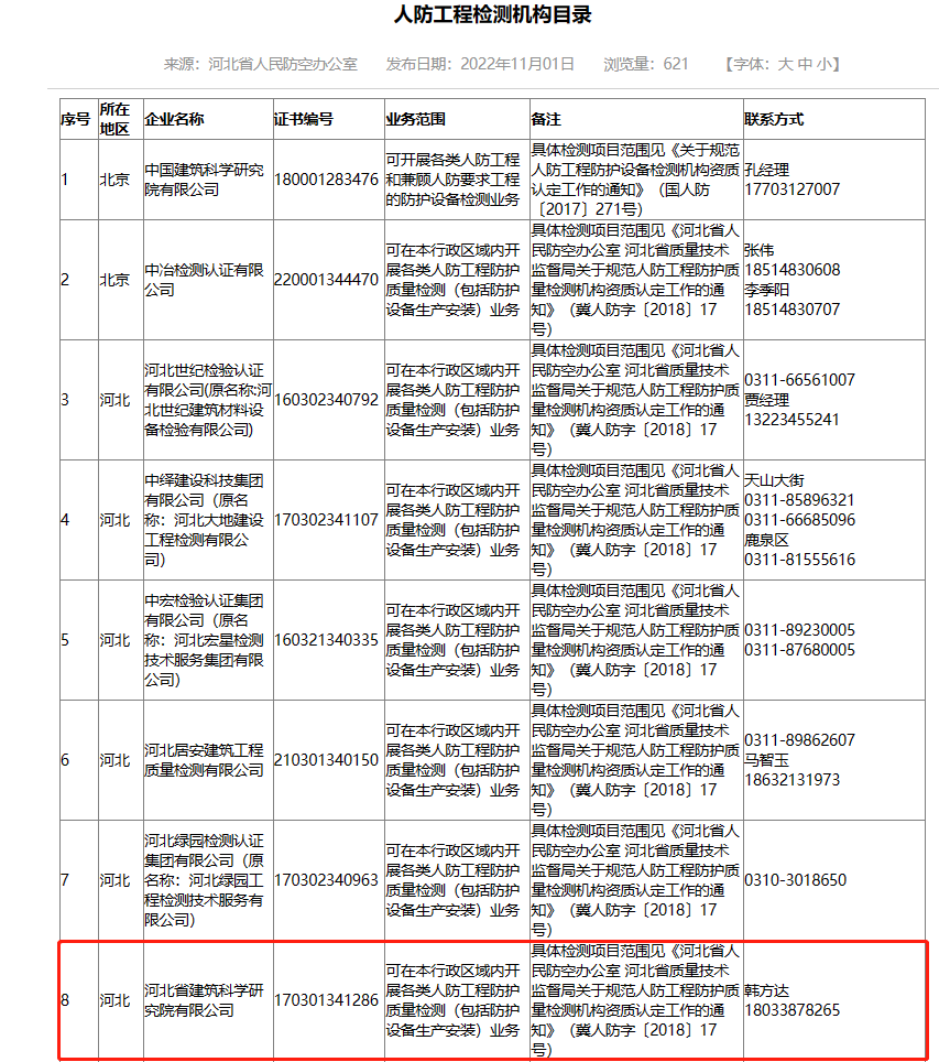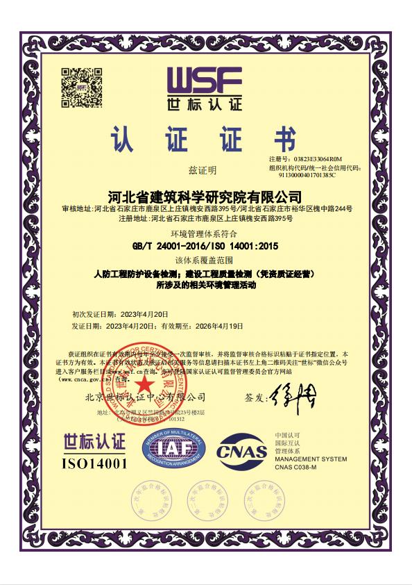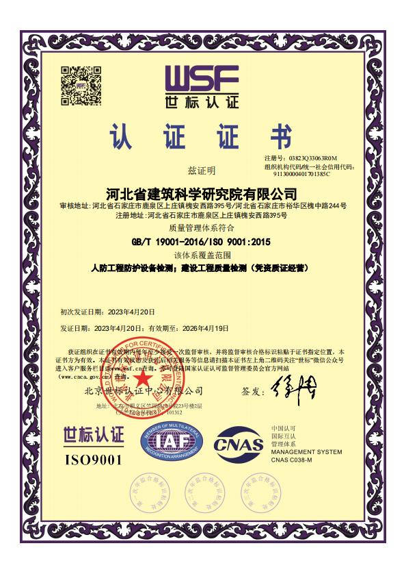 河北省建筑科學研究院有限公司人防工程檢測機構證明