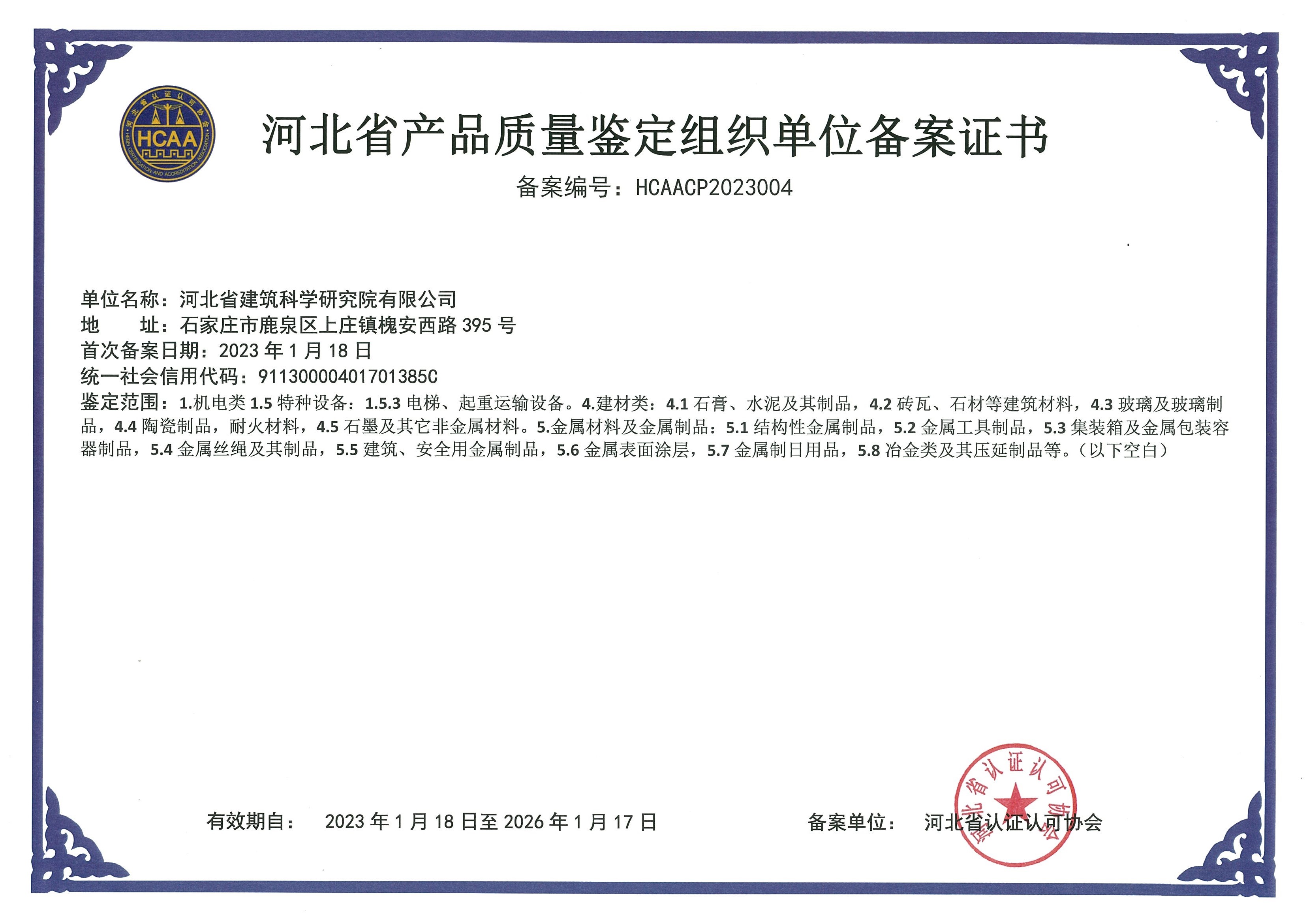 河北省建筑科學研究院有限公司產品質量鑒定組織單位備案證書2
