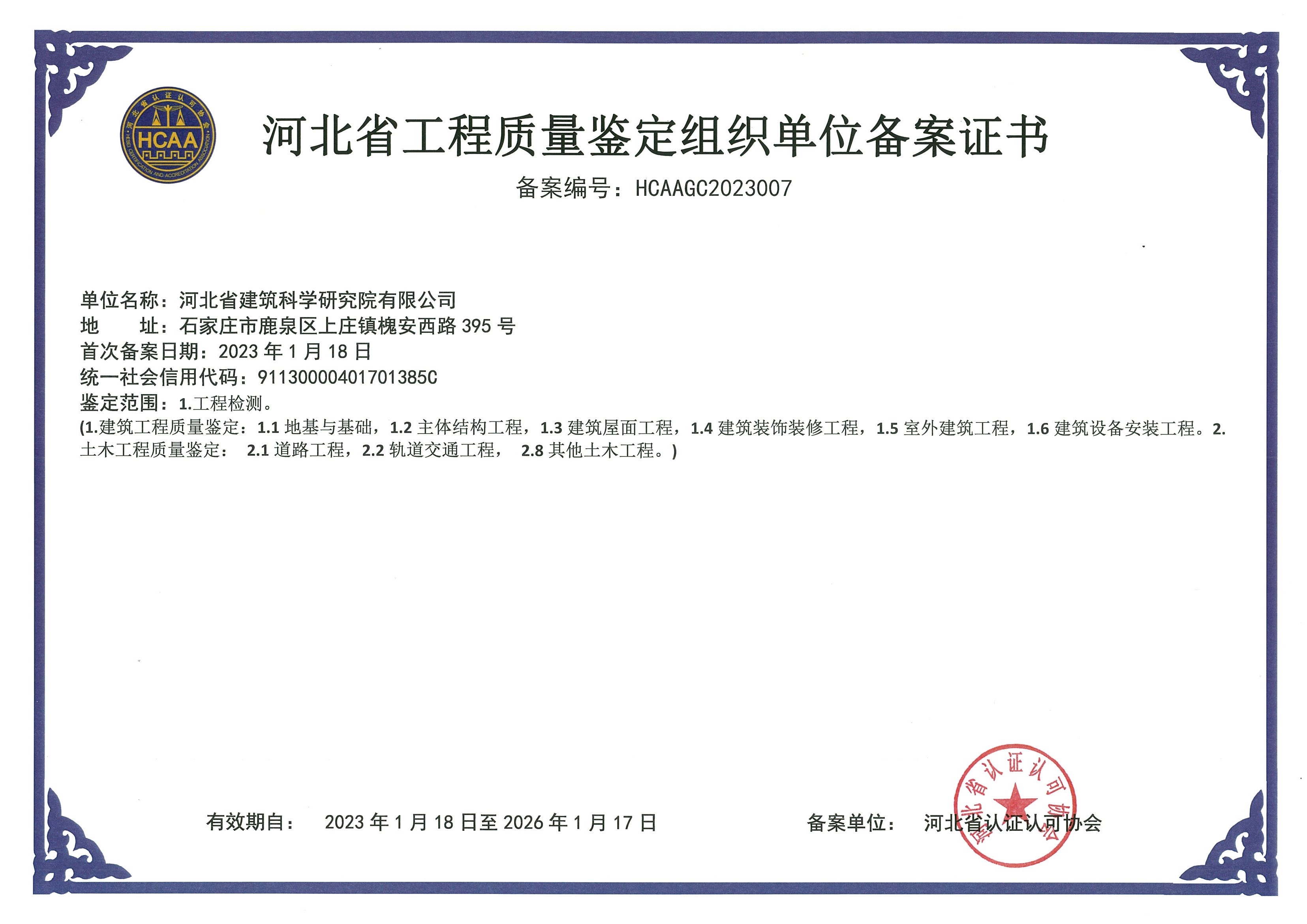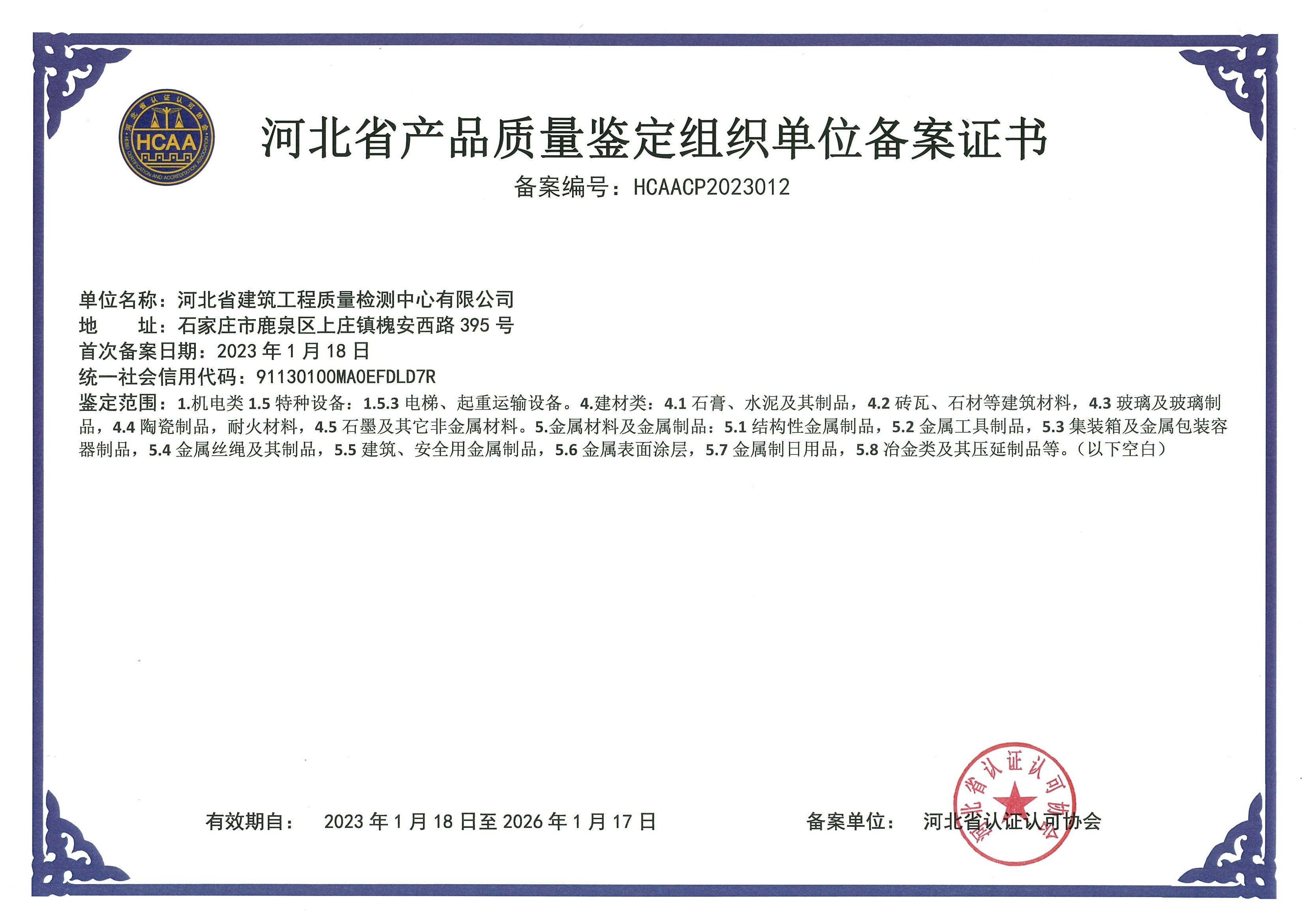河北省建筑工程質量檢測中心產品質量鑒定組織單位備案證書1