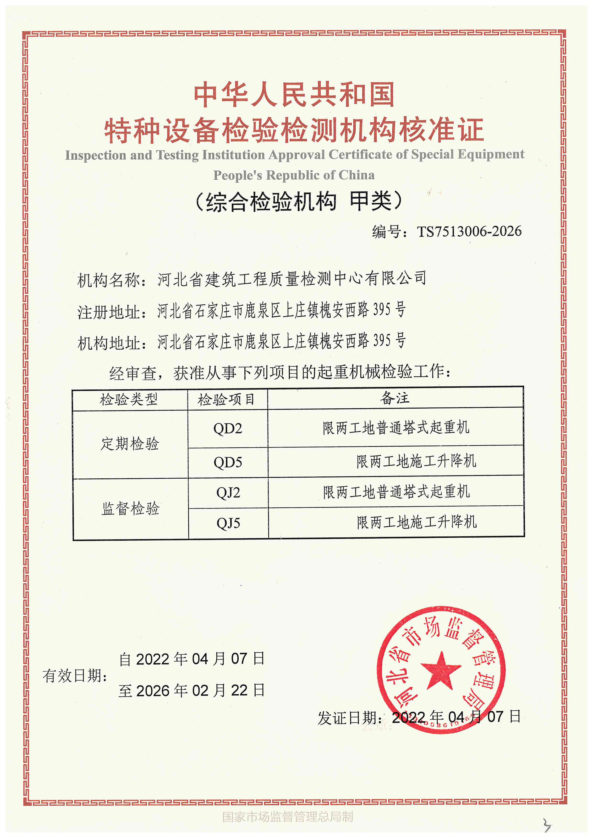 河北省建筑工程質量檢測中心特種設備檢驗檢測機構核準證